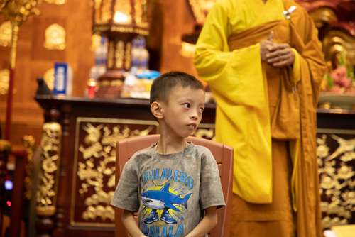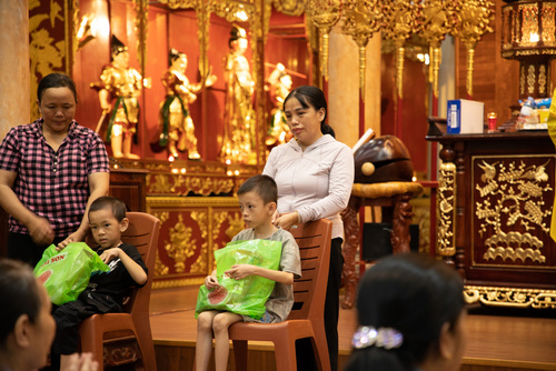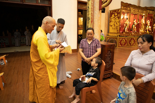 Song, buổi lễ không dừng lại ở nỗi niềm sám hối riêng tư. Trong không khí đêm rằng Trung Thu – biểu tượng của sự viên mãn và đoàn tụ – chư Tăng đã mở rộng vòng tay từ bi, gửi tặng gần 200 phần quà yêu thương đến các em nhỏ bại não, những tâm hồn phi thường đang kiên cường đối mặt với nghịch cảnh thân xác. Những món quà giản dị ấy, như những đóa sen nở giữa bùn lầy, mang theo hơi ấm của tứ vô lượng tâm: từ, bi, hỷ, xả. Quý Thầy ân cần động viên các bậc phụ huynh hãy vững niềm tin vào Tam Bảo, thực hành sự tỉnh thức giúp các gia đình nuôi dưỡng ánh sáng tình thương.