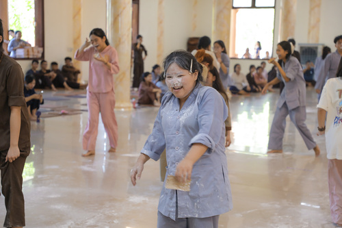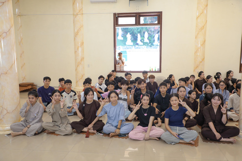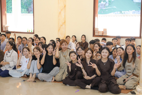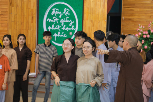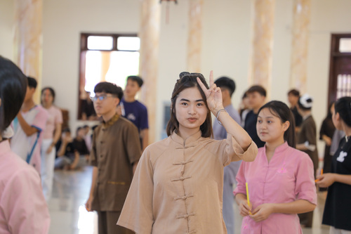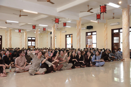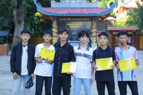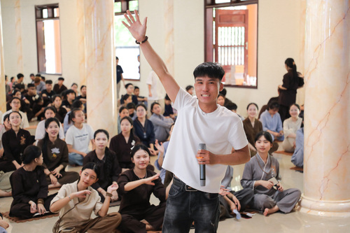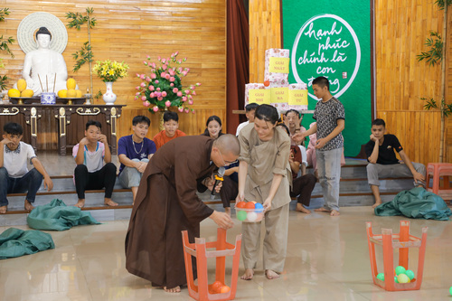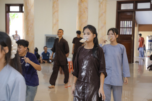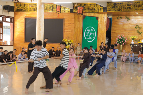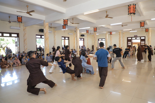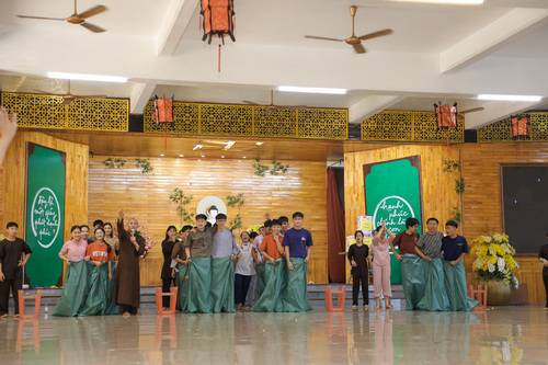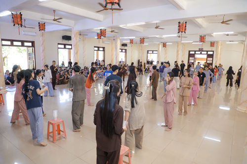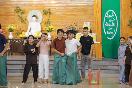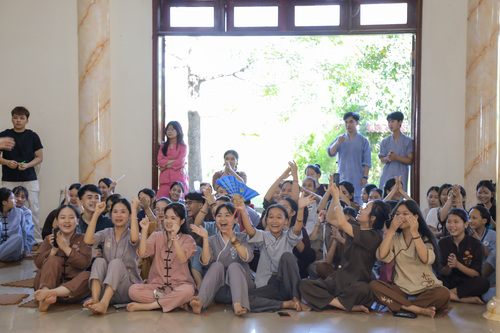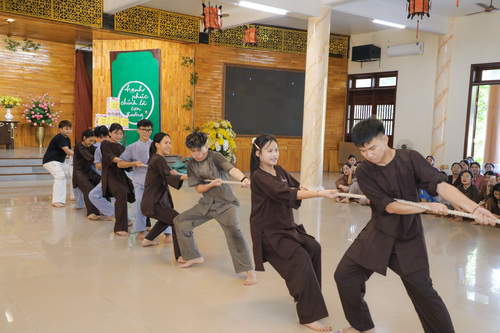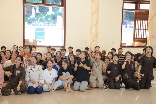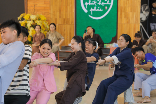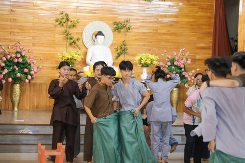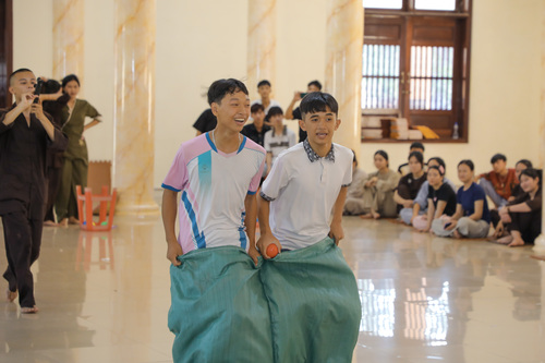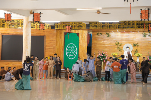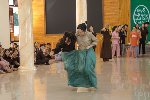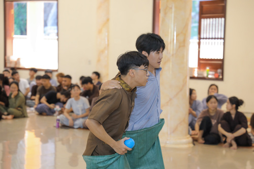 Thế nhưng, khóa tu không chỉ dừng lại ở sự tĩnh tâm. 14h chiều, sau thời khóa hồi hướng công đức của mình. Bầu không khí tại chùa Cổ Am bỗng trở nên vô cùng rộn ràng. Thay vì chia tay, các bạn được tham gia vào một ngày hội gia đình đặc biệt. Từng nhóm nhỏ, với những thành viên được phân sẵn, đã cùng nhau phá tan sự e ngại ban đầu, hòa mình vào tiếng cười giòn tan trong các trò chơi tập thể. Đây không chỉ là những phút giây vui đùa, mà còn là cơ hội để gắn kết, để thấu hiểu và để tình cảm trở nên chân thành hơn bao giờ hết.