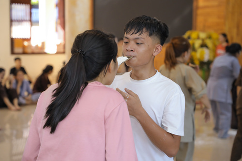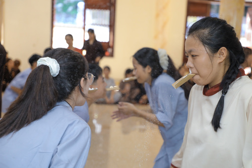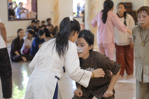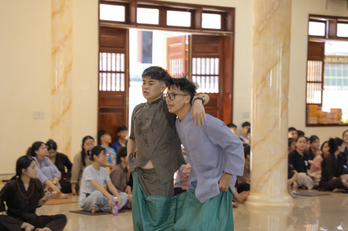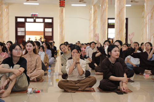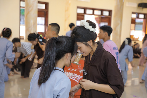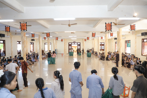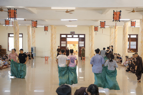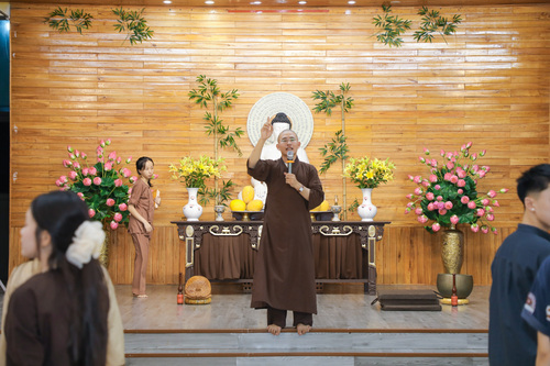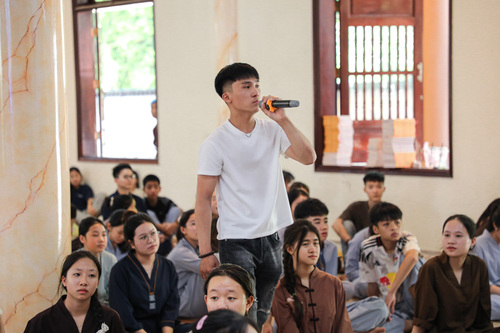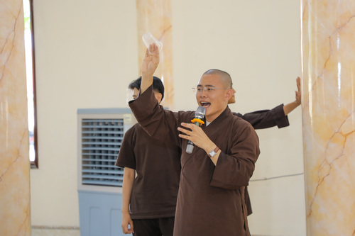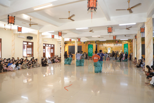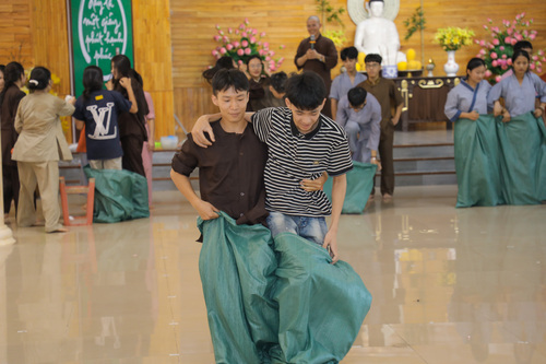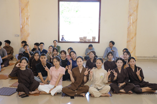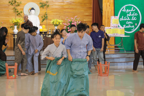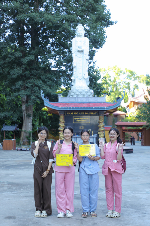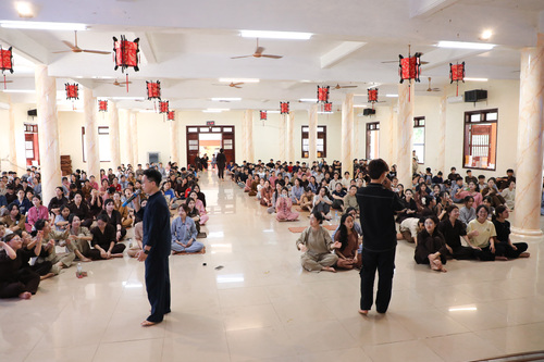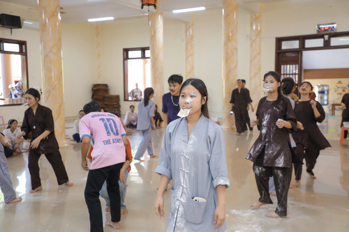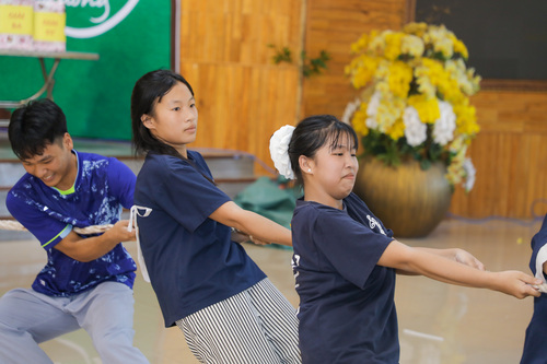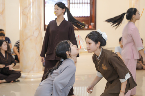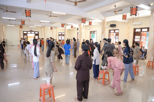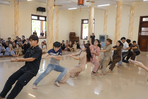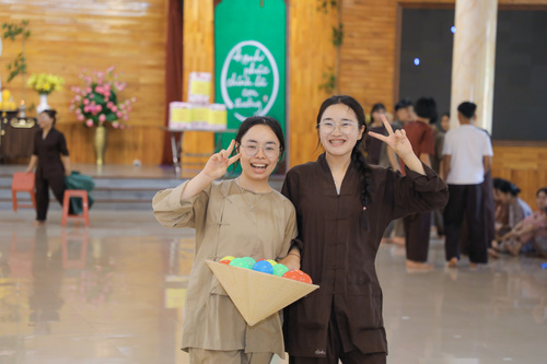 Thế nhưng, khóa tu không chỉ dừng lại ở sự tĩnh tâm. 14h chiều, sau thời khóa hồi hướng công đức của mình. Bầu không khí tại chùa Cổ Am bỗng trở nên vô cùng rộn ràng. Thay vì chia tay, các bạn được tham gia vào một ngày hội gia đình đặc biệt. Từng nhóm nhỏ, với những thành viên được phân sẵn, đã cùng nhau phá tan sự e ngại ban đầu, hòa mình vào tiếng cười giòn tan trong các trò chơi tập thể. Đây không chỉ là những phút giây vui đùa, mà còn là cơ hội để gắn kết, để thấu hiểu và để tình cảm trở nên chân thành hơn bao giờ hết.