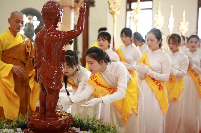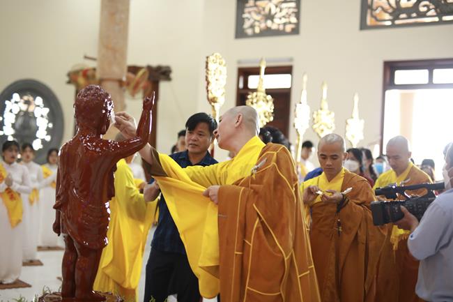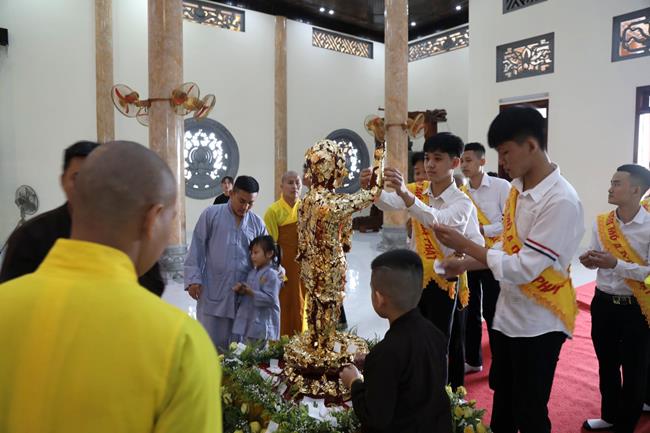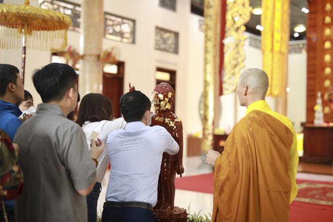 Sau những nghi thức hành chính thì toàn thể hội chúng thể hiện nghi thức tắm Phật tâm linh như mong muốn gột rửa đi những hạt bụi trần, tịnh hoá thân tâm để mang đến niềm an vui và sự hỷ lạc cho chính mình và những người xung quanh. Cuối buổi lễ, Đại chúng tuần tự cùng nhau quy tụ tại Bảo điện nhận một lá vàng (miễn phí) để tự tay dát lên sơ sanh bảo tượng tô điểm cho Ngài với ước nguyện cho một tương lại tốt đẹp sẽ đến khắp mọi nơi như hạnh nguyện của Ngài.
