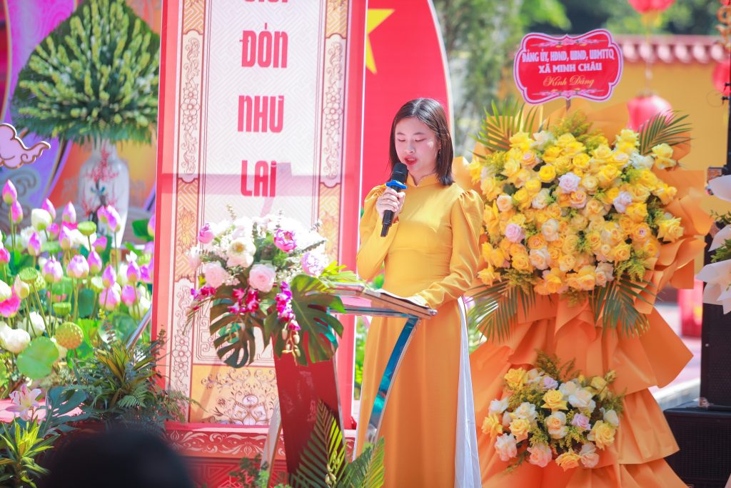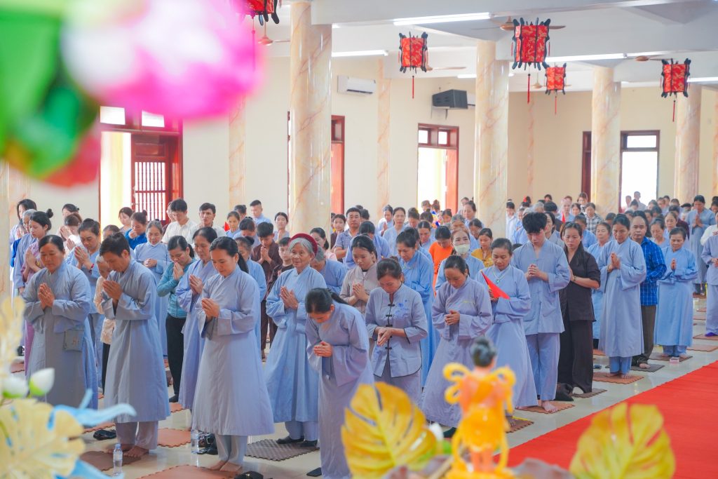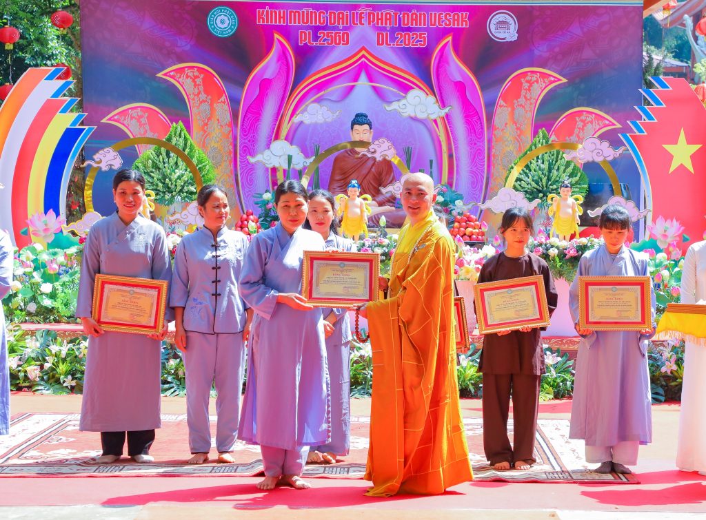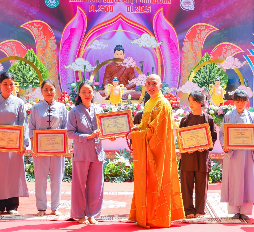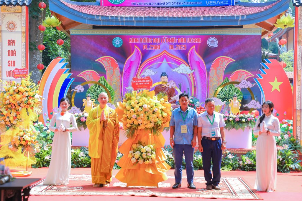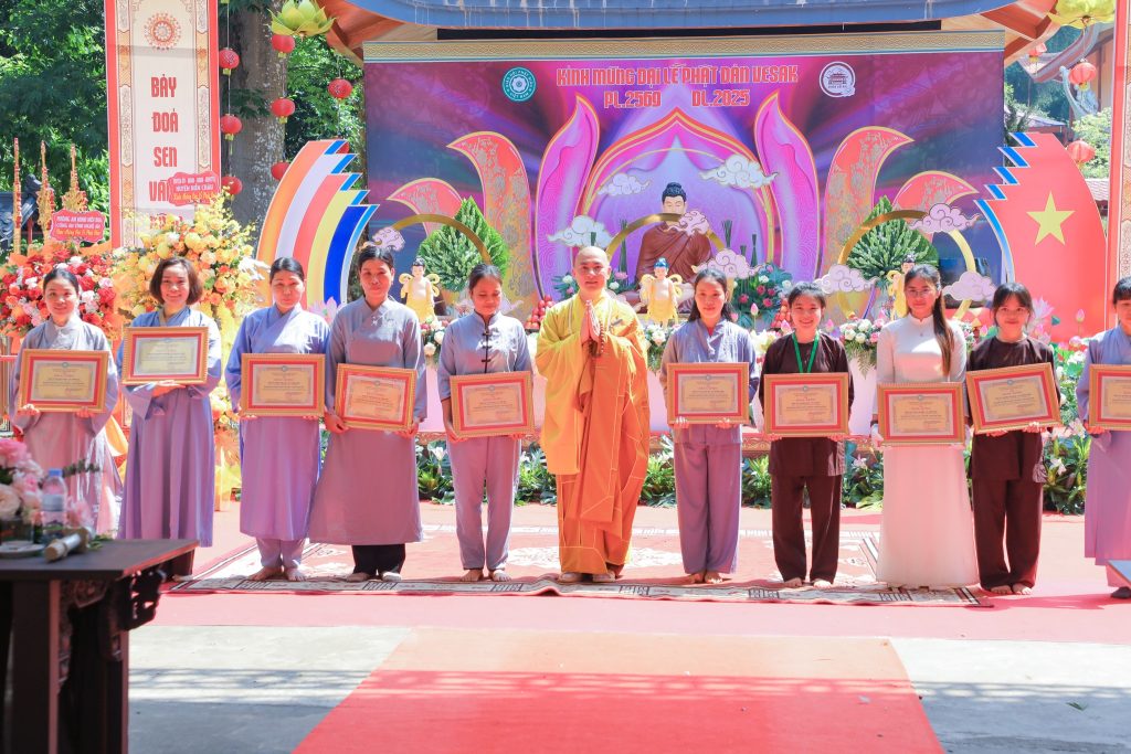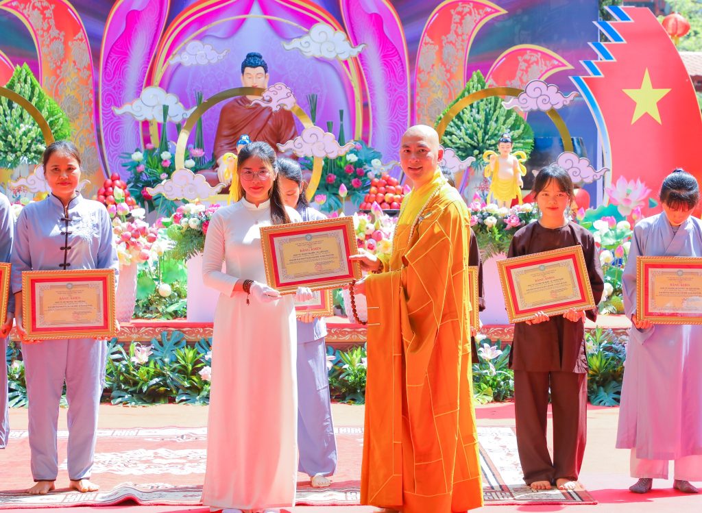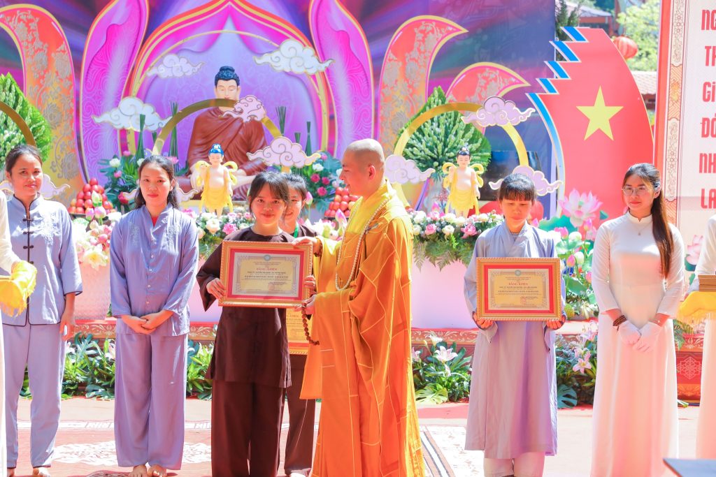 Tiếp nối chương trình, Đại Đức Trụ Trì cũng đã thay mặt toàn thể chư Tôn Đức để đón nhận những lẵng hoa tươi thắm của các cấp chính quyền, quý doanh nghiệp, các nhà hảo tâm, trên địa bàn Huyện Diễn Châu cùng với hàng ngàn đoá hoa sen tâm, tinh khiết của tất cả Phật tử và mọi người đang xem trực tuyến trên trang chùa, để gửi gắm lên cho Đức thế tôn. Trong buổi lễ, Đại đức Thích Tâm Thành cũng đã trao tặng bằng khen cho quý Phật tử đạt điểm tuyệt đối trong buổi thi giáo lý cấp huyện vừa qua.