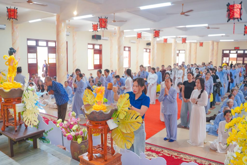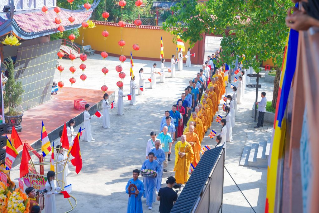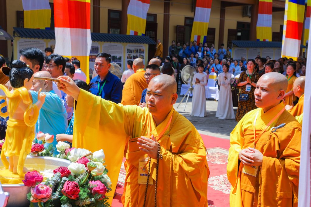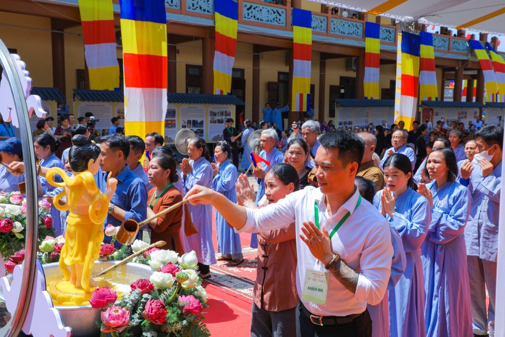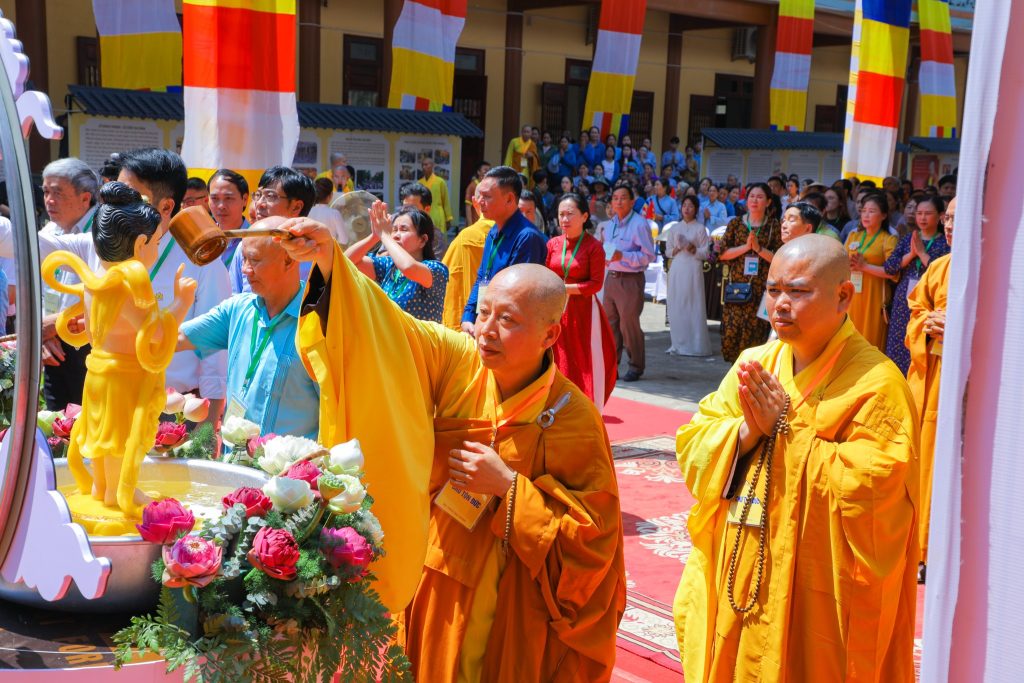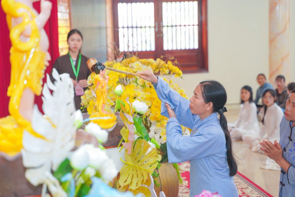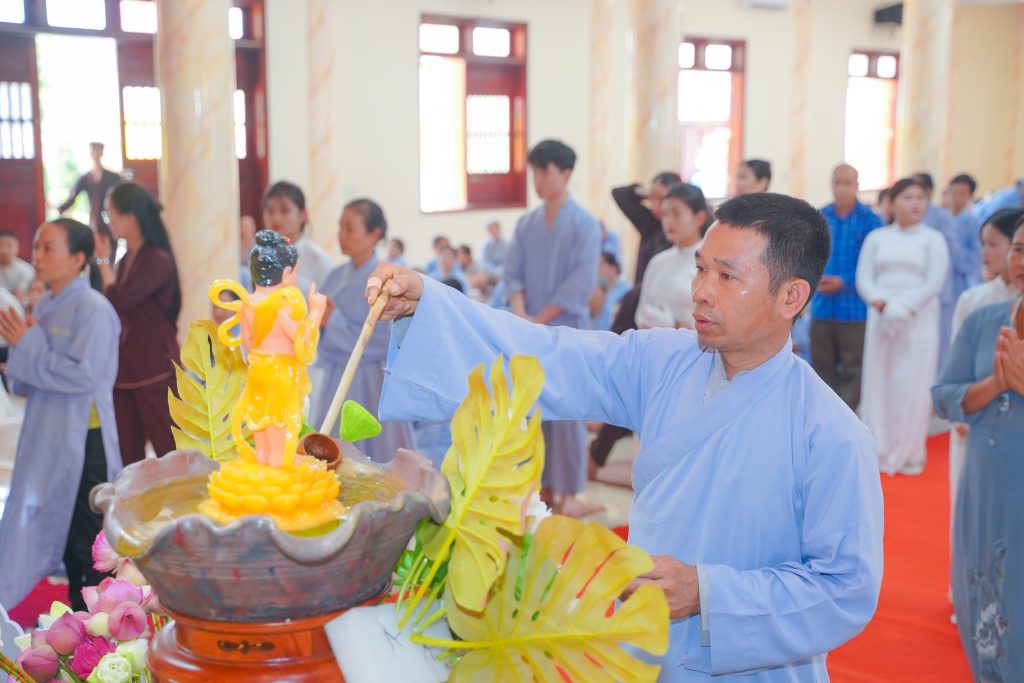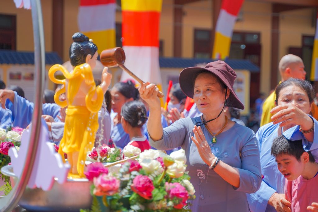 Trong giờ phút thiêng liêng, gió lặng chim ngừng, trái đất rung chuyển bảy lần, mưa rơi đòn mừng đấng từ phụ giáng thế, lễ cung rước sinh thần của Đức Từ Phụ và cử hành nghi thức khánh đản đã được diễn ra. Chư Tôn đức cùng quý quan khách trang nghiêm tôn kính thực hiện nghi thức Mộc Dục truyền thống. Khoảnh khắc khi rưới những dòng nước tinh khiết lên tôn tượng của Đấng Từ Phụ, đó chính là nhân duyên thù thắng để mỗi người quay về với chính mình, hầu tự sách tấn, tự trang nghiêm cho bản thân bằng hương đức hạnh, bằng hoa trí tuệ, và bằng nước nhẫn nhục, từ ái, tùy thuận thích ứng với mọi nhân duyên, ngay cả chướng duyên để hướng đến một nếp sống hướng thượng, tỉnh giác. Buổi lễ kết thúc thành tựu viên mãn trong niềm hỷ lạc của tất cả mọi người.