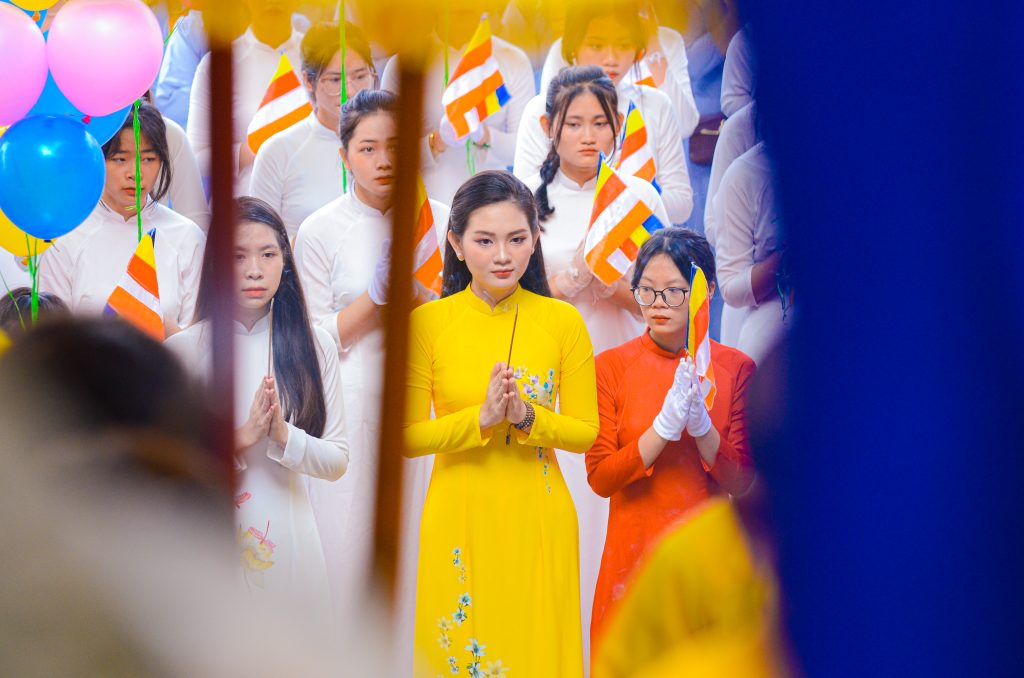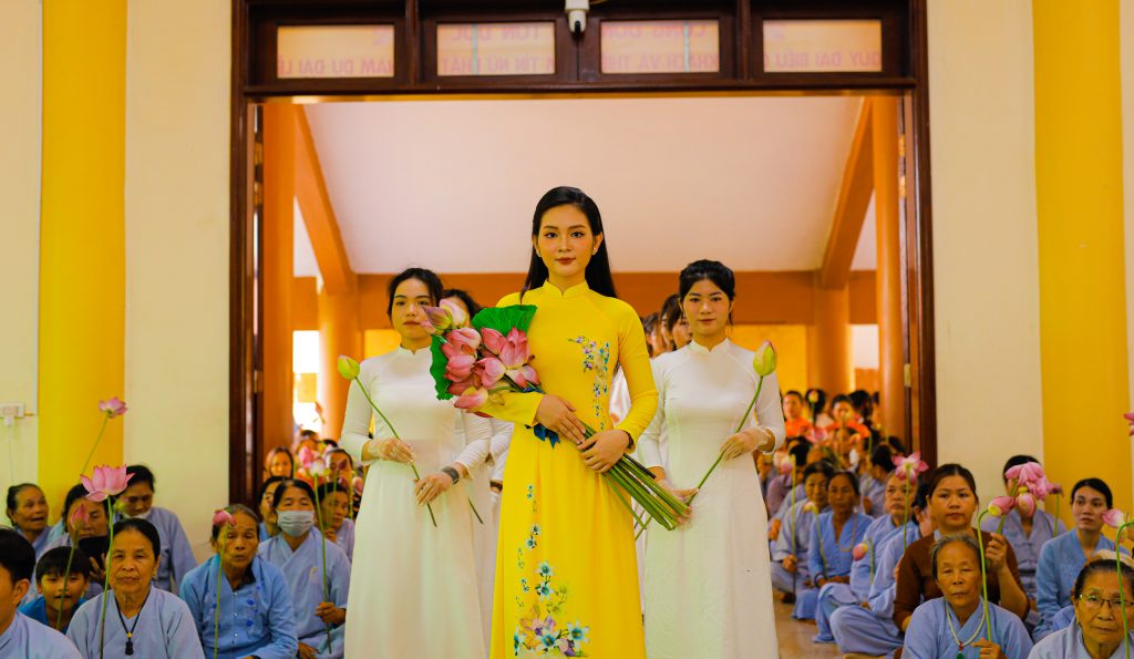 Trong đại lễ, được khoác lên mình tà áo dài truyền thống của người con gái Việt kết hợp với những họa tiết của Hoa Sen thanh khiết, Như một sự kết hợp hài hòa giữa Phật giáo và Dân tộc.
