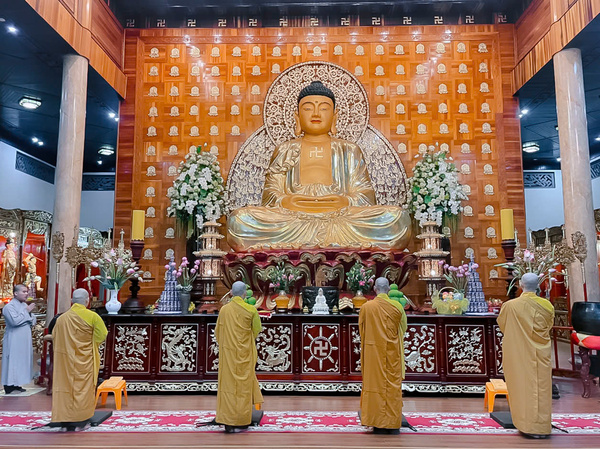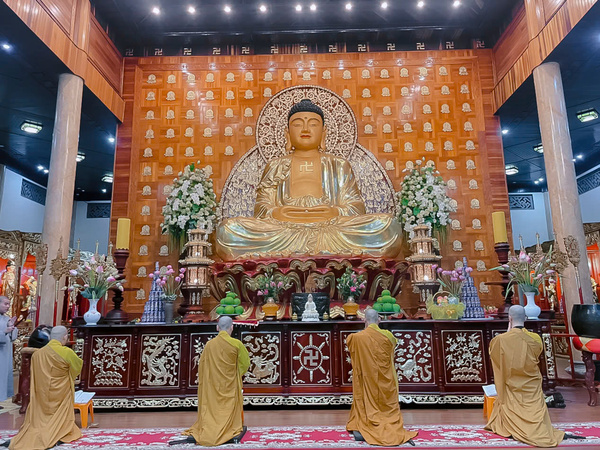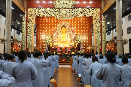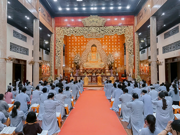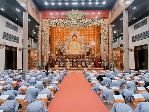 Khi thời gian bước sang 19 giờ 30 phút, tiếng chuông mõ cất lên vang vọng giữa lòng đêm, như lời tỉnh thức mời gọi đại chúng trở về nương tựa nơi Tam Bảo, quay lại với chính mình. Dưới sự hướng dẫn của chư Tăng bổn tự, toàn thể đạo tràng thành tâm đảnh lễ Hồng Danh chư Phật, sám hối những nghiệp chướng đã tạo từ ba nghiệp thân, khẩu, ý trong đời sống thường nhật.