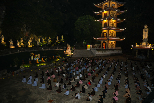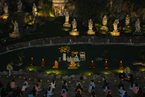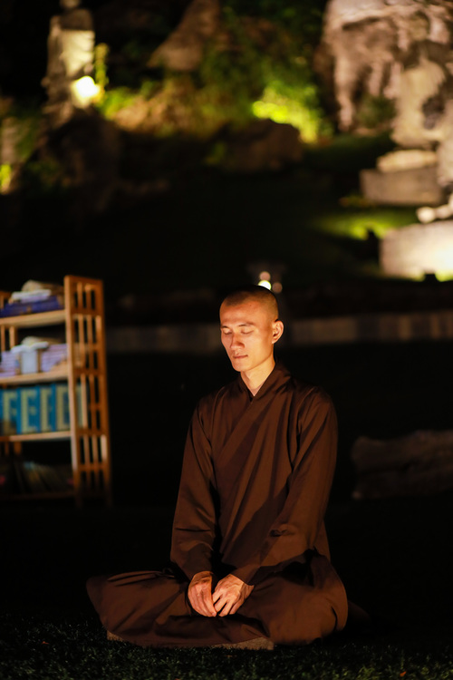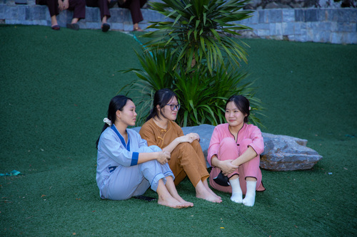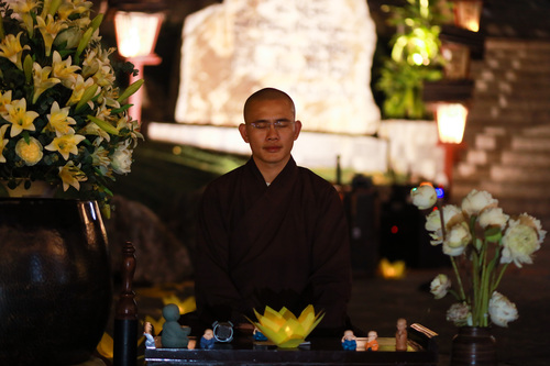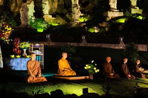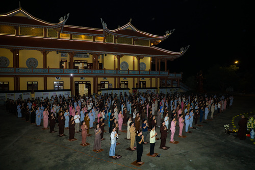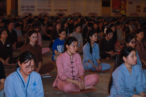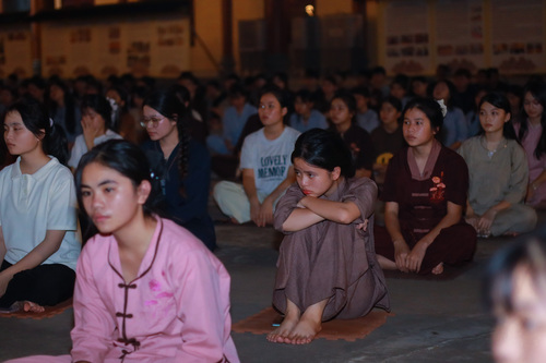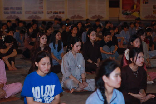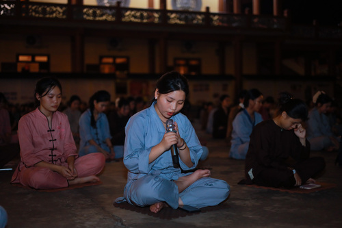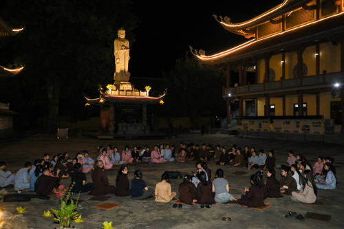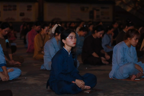 Hoàng hôn xuống, tiếng chuông báo hiệu giờ cơm chiều vang lên. Bữa cơm chay đầu tiên của khóa tu đạm bạc, chỉ là cơm trắng, rau luộc, canh thanh đạm…. Chính trong sự tĩnh lặng và chánh niệm, các bạn thực tập ăn trong im lặng, nhai chậm rãi, cảm nhận sâu sắc từng hạt cơm như đang nếm trọn, nhớ lại ân tình của cha mẹ, của người nông dân và cả những người đã góp phần tạo nên mâm cơm đầy đủ hôm nay.