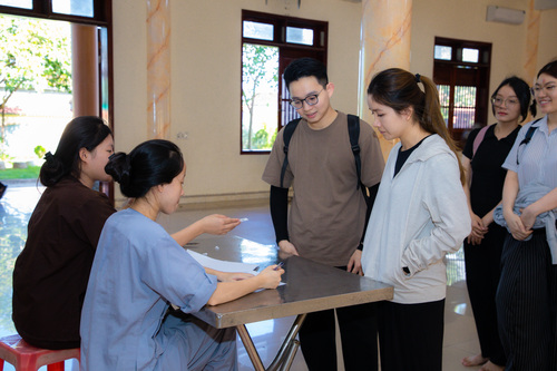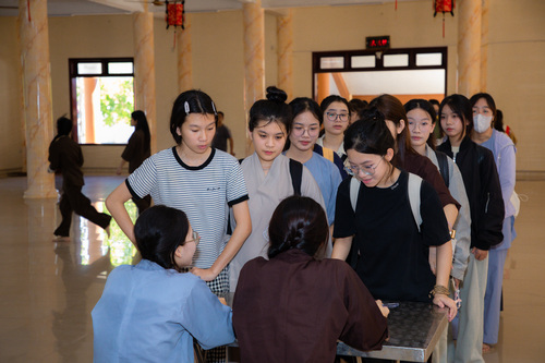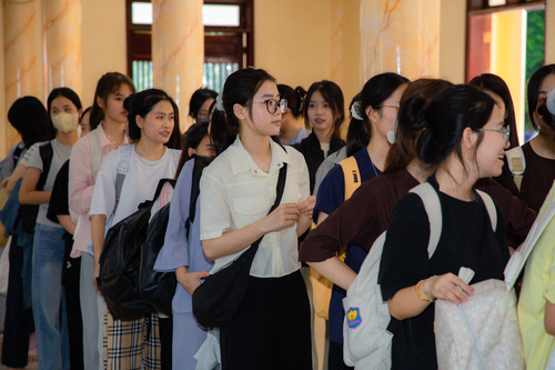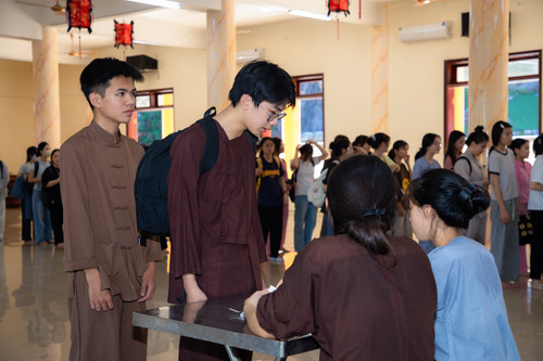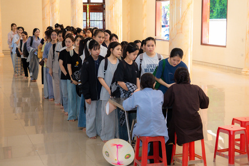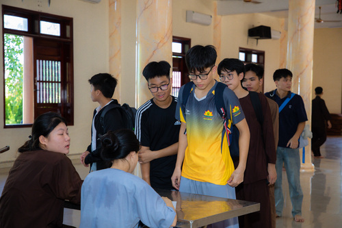 Sau khi hoàn tất thủ tục đăng ký và ổn định chỗ ở, các bạn được hướng dẫn tham quan khuôn viên chùa. Khi nghe hiệu lệnh tập trung, các bạn khoá sinh vân tập về giảng đường, cùng lắng nghe Đại Đức … hướng dẫn các bạn thực tập oai nghi trong chốn thiền môn. Từ cách đi đứng, chắp tay, cúi chào, đến từng cử chỉ nhỏ nhặt trong đời sống hằng ngày. Những bài học giản dị bước khởi đầu cho hành trình tu dưỡng đạo đức và rèn luyện thân tâm.