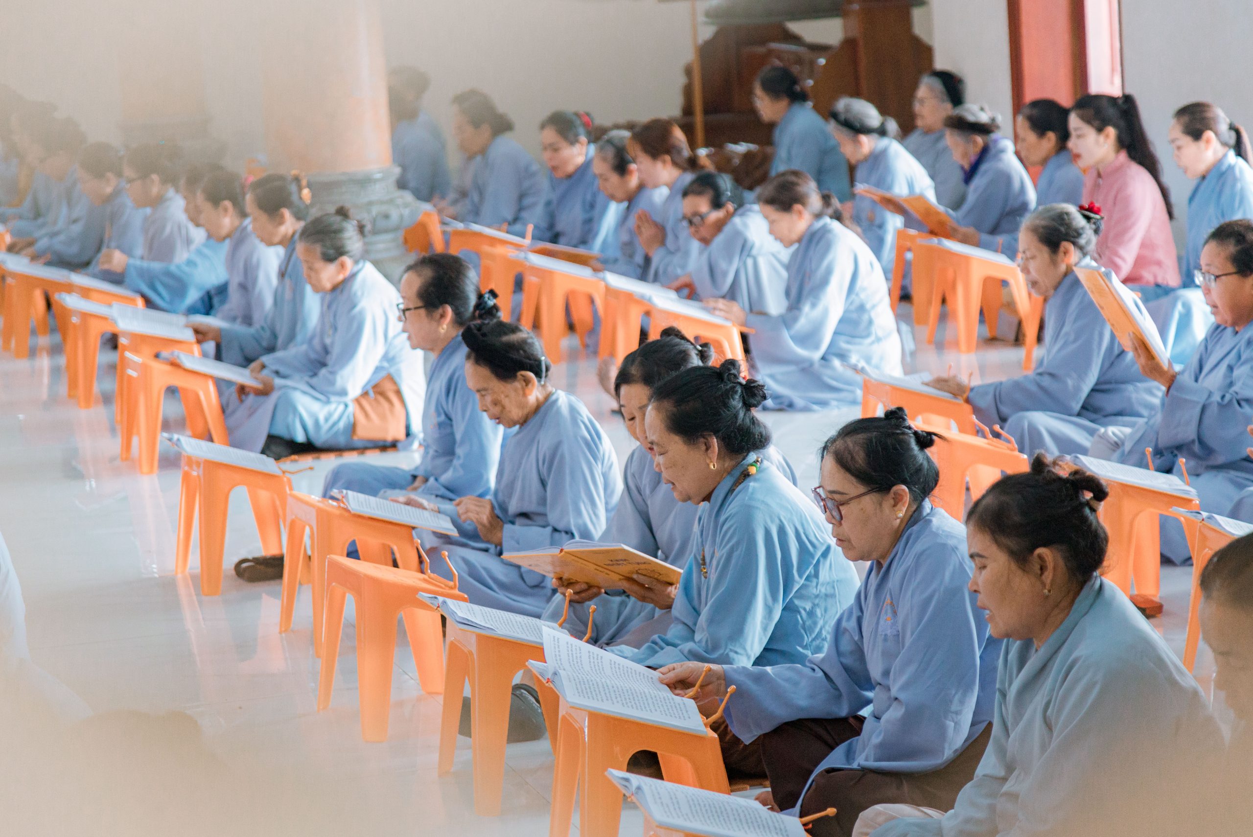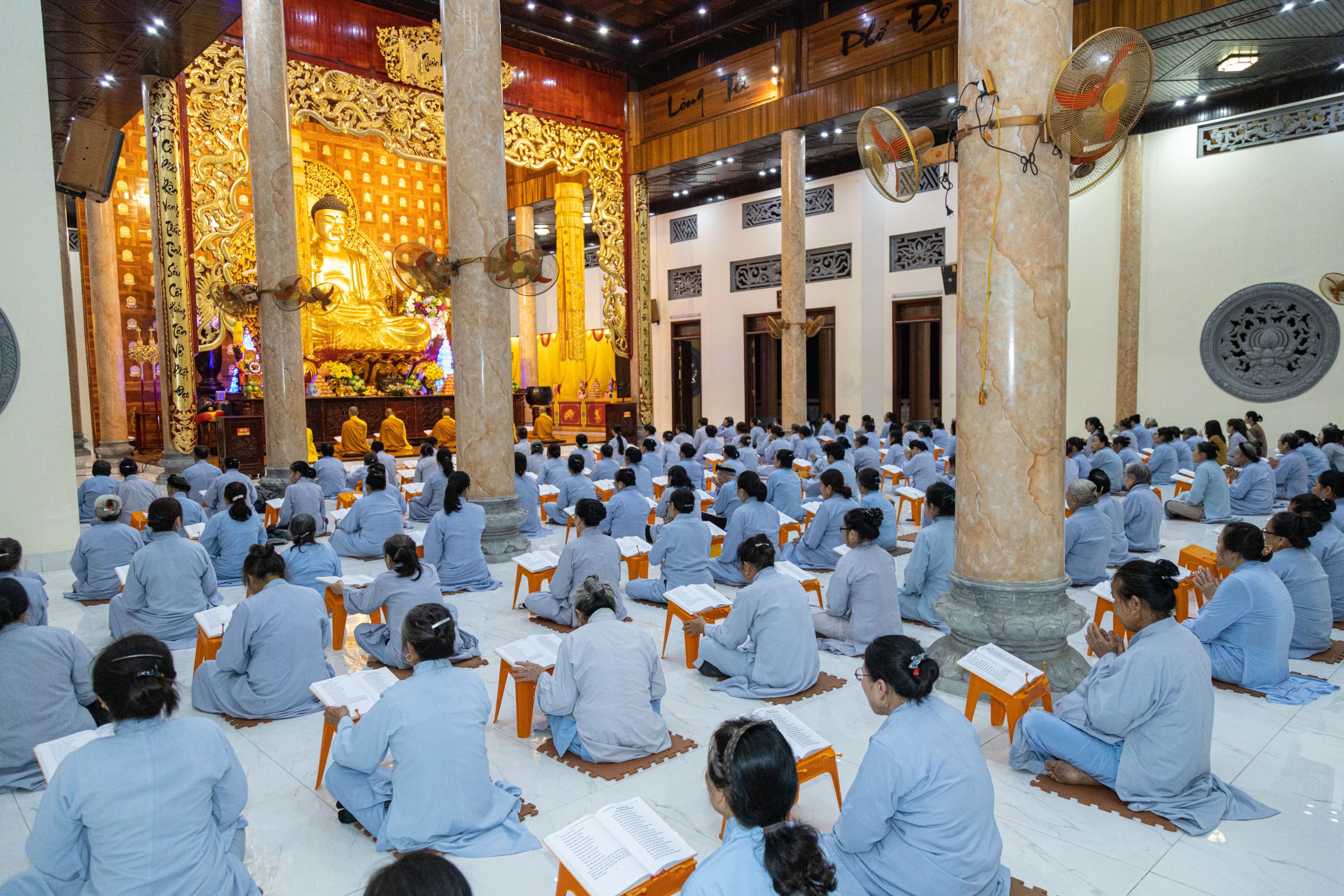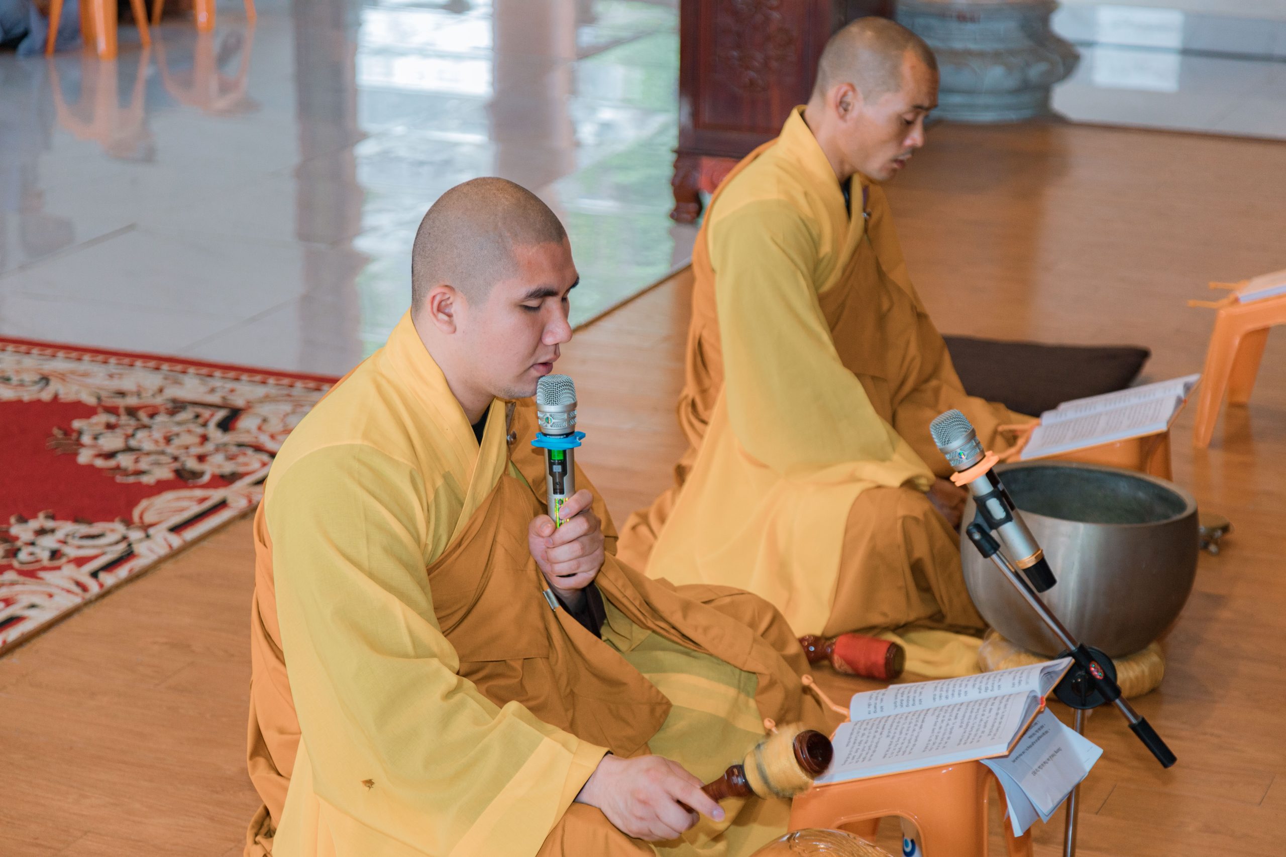 Sau khi dùng bữa sáng, chư Tăng cùng quý Phật tử bước vào thời khóa tụng kinh, đi kinh hành và niệm Phật.