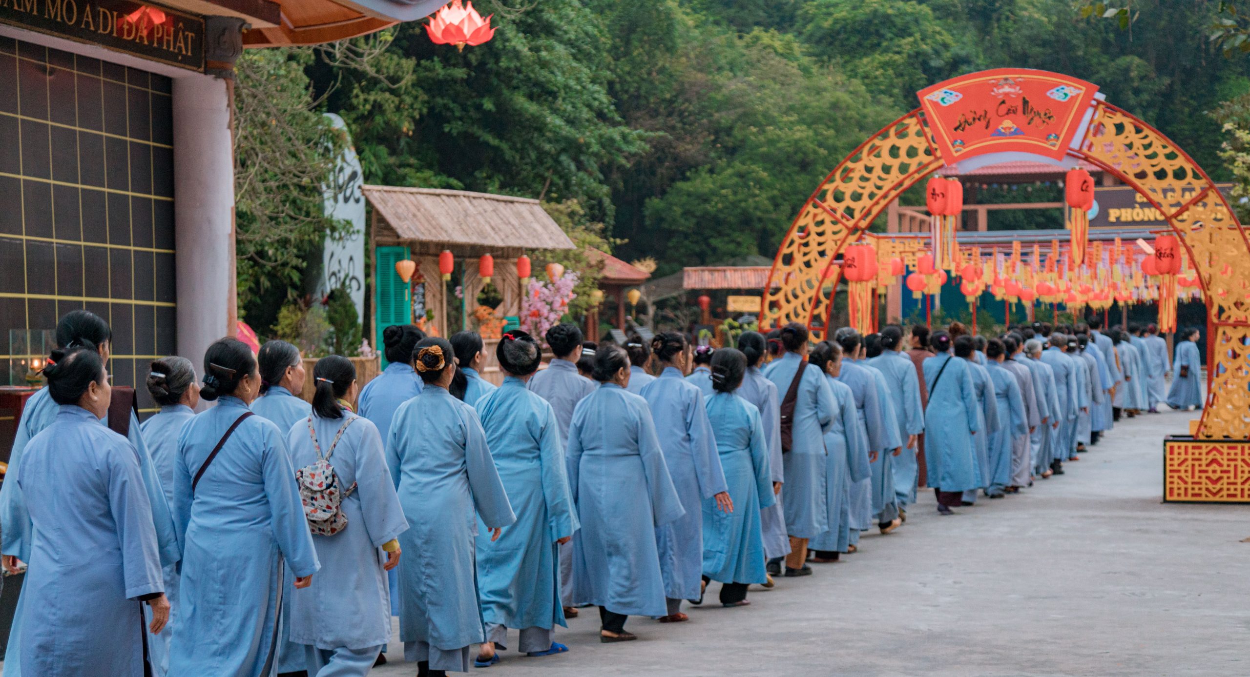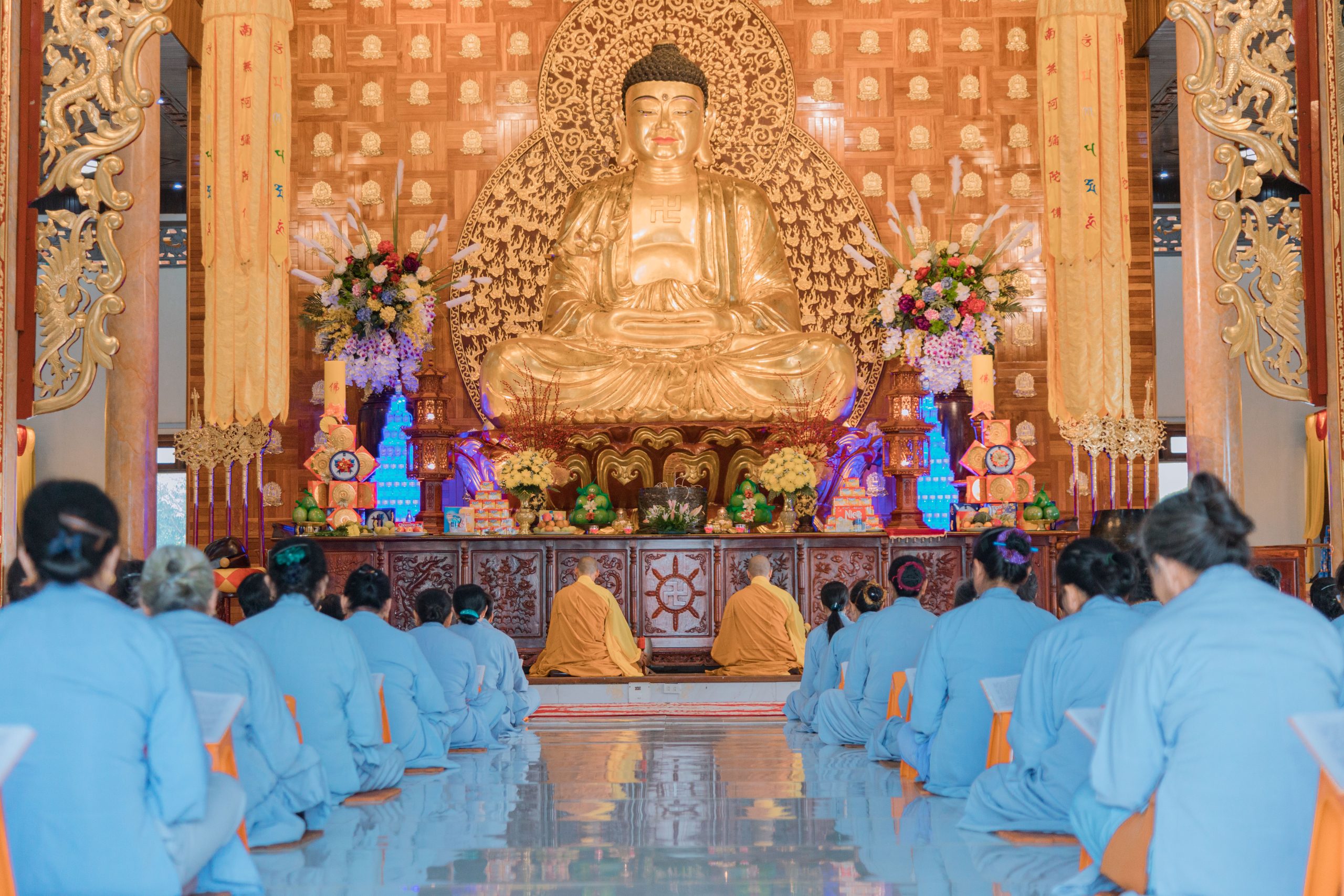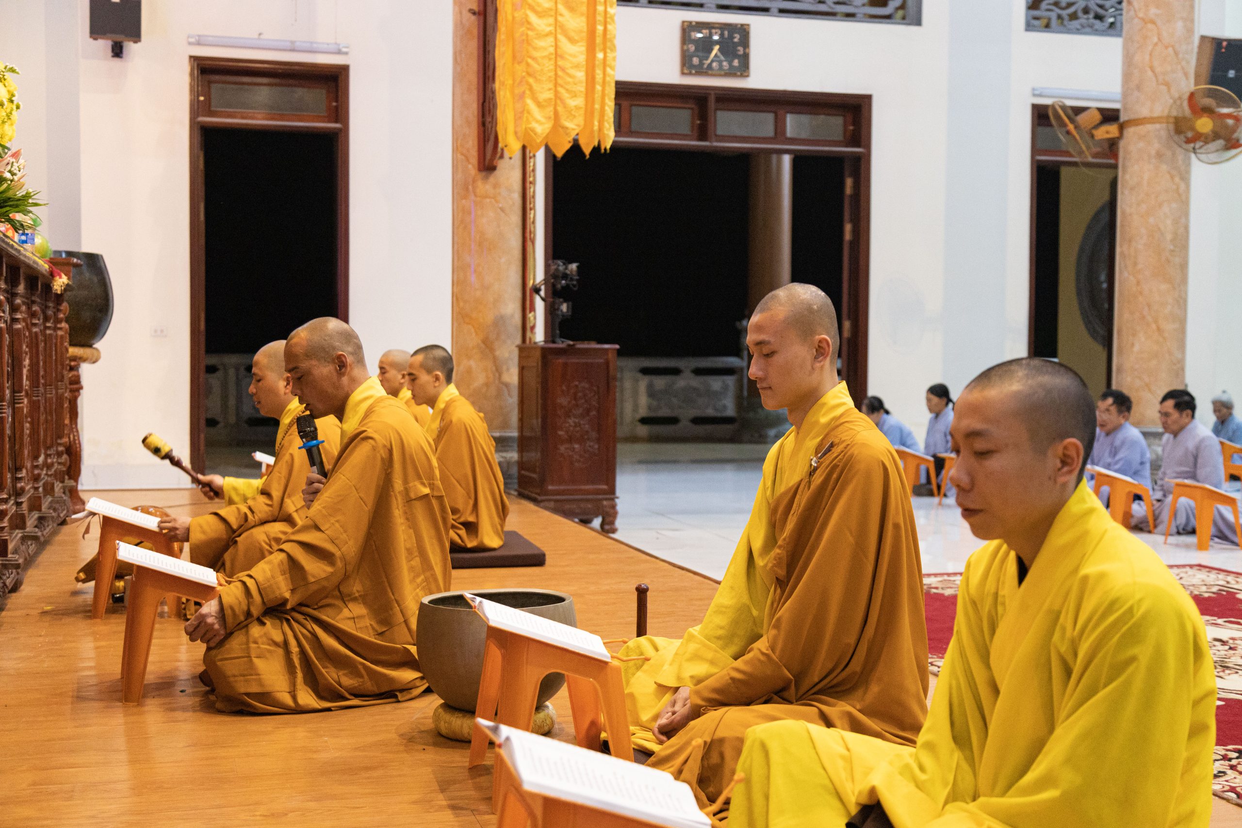 Sau khi dùng bữa sáng, chư Tăng cùng quý Phật tử bước vào thời khóa tụng kinh, đi kinh hành và niệm Phật.