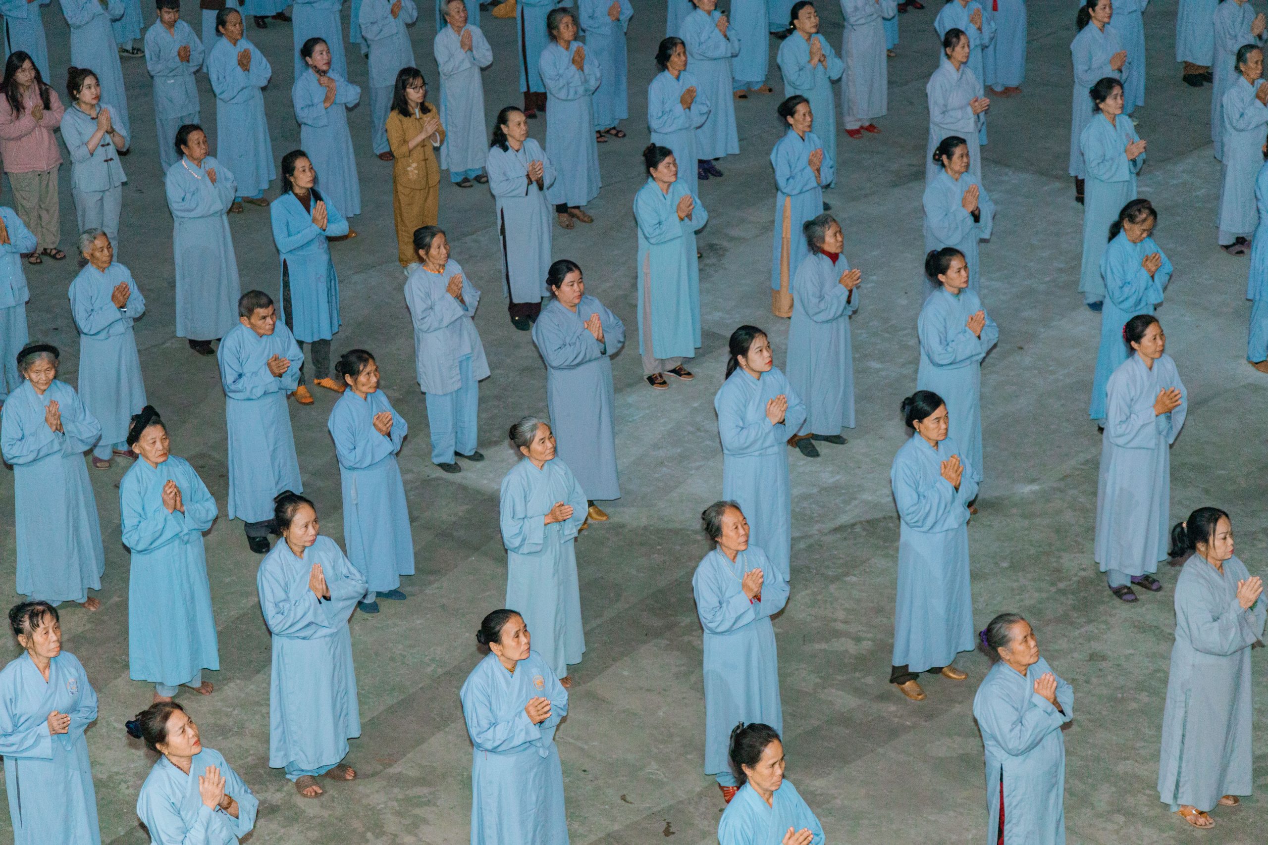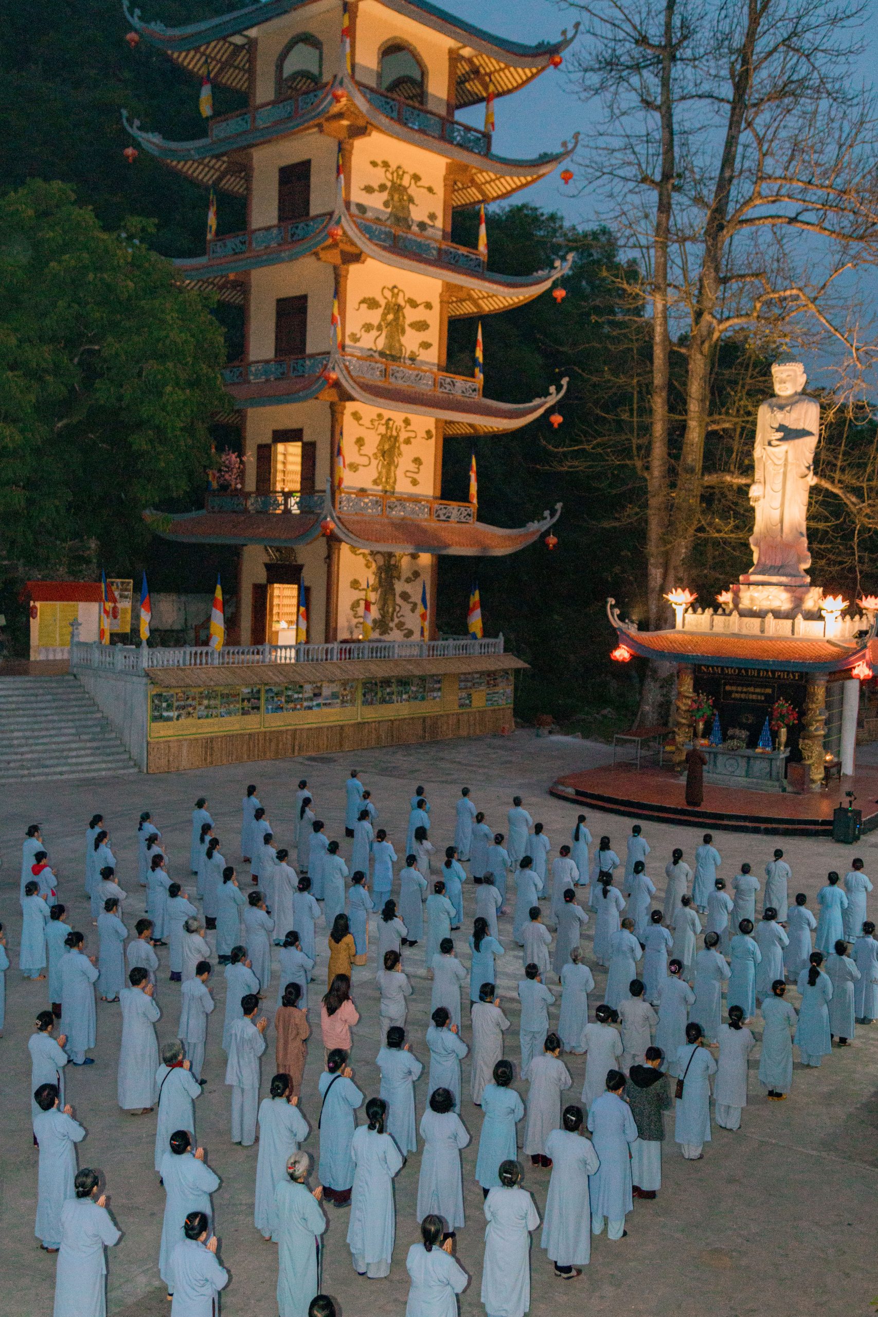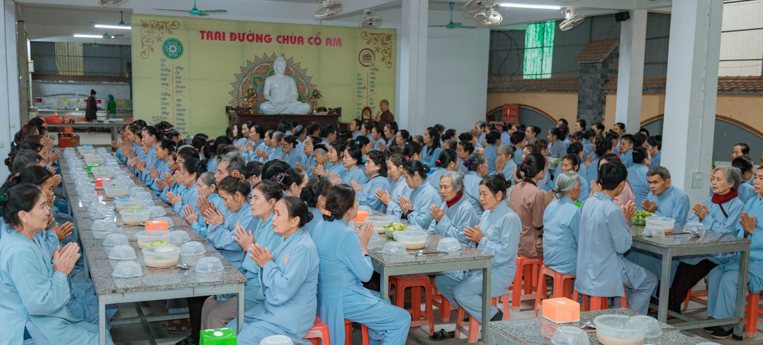 Buổi sáng sau khi thức chúng, đúng 4h00, đại chúng cùng nhau vân tập lên Chánh Điện bước vào thời khóa tụng kinh Người Áo Trắng và đi kinh hành niệm Phật.