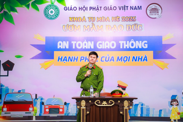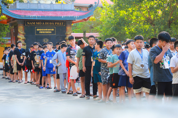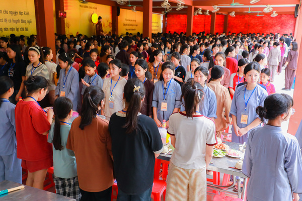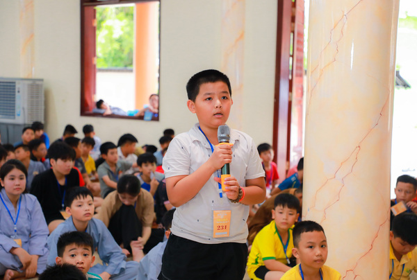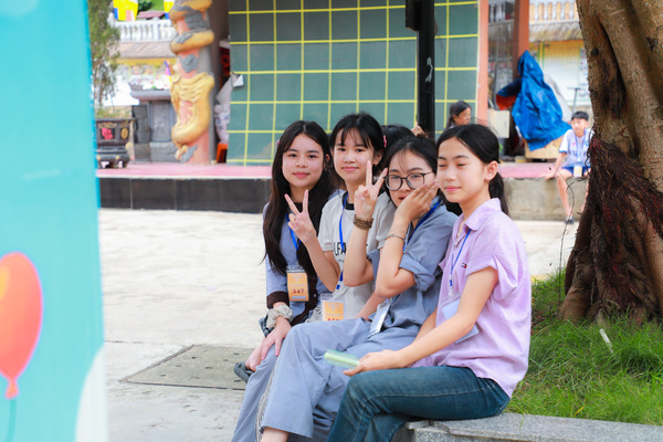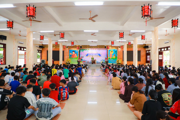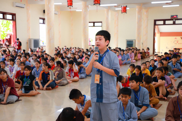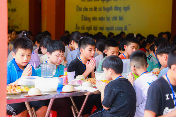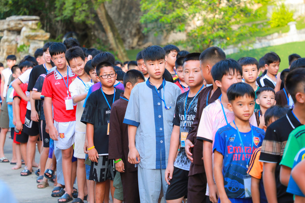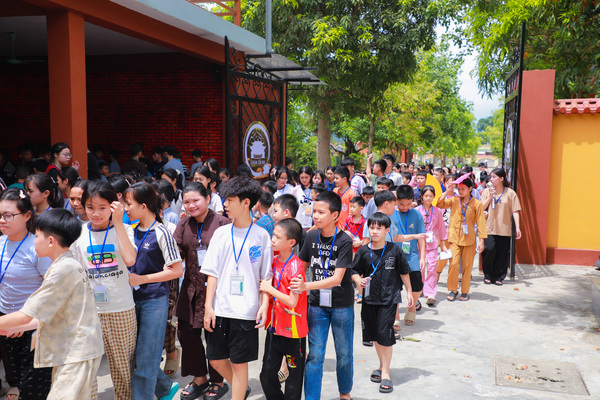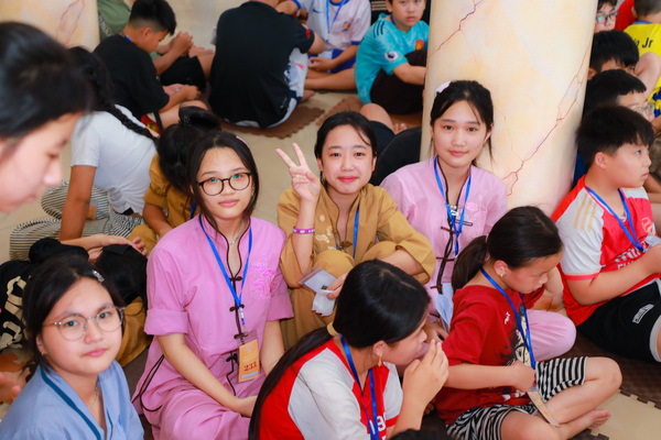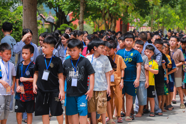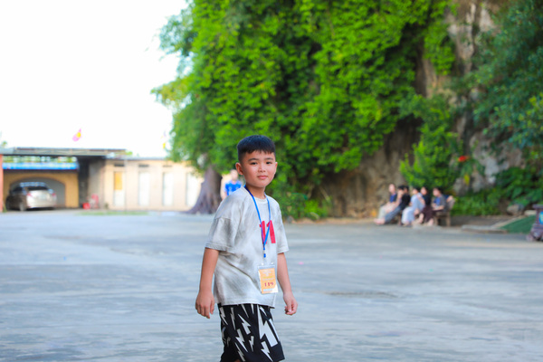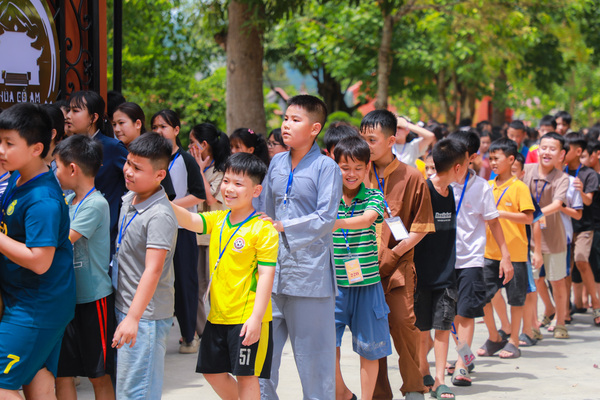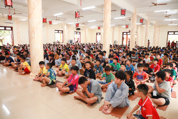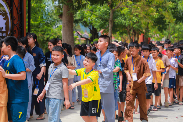 Vào lúc 05h00 sáng ngày 20/06/2025, khi những tia nắng đầu tiên còn đang e ấp sau làn mây xanh, tiếng chuông chùa ngân lên giữa đất trời thanh tịnh, nhẹ nhàng đánh thức cả vườn tâm, gọi mời những tâm hồn thơ trẻ bắt đầu một ngày mới nơi cửa thiền. Ngày đầu tiên với các em có chút bỡ ngỡ, có em còn ngái ngủ, mắt lim dim, chậm rãi bước từng bước nhỏ theo bạn bè. Có em khẽ dựa vào bạn, nép mình trong cái se lạnh sớm mai, vừa rụt rè vừa tò mò với thế giới mới đang dần mở ra. Từng nét mặt, từng dáng đi tuy còn bỡ ngỡ, nhưng đâu đó đã ánh lên sự bình an, lắng dịu – điều mà có lẽ, lâu lắm rồi, các em mới được cảm nhận từ nhịp sống vội vàng ngoài kia. Tuy nhiên, chỉ một lúc sau, sân chùa đã rộn ràng tiếng bước chân, tiếng gọi nhau khe khẽ, và những nụ cười hồn nhiên dần hé nở.