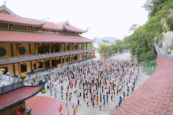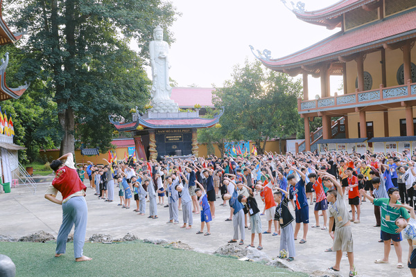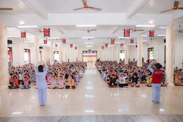 Buổi thể dục diễn ra trong ánh sáng tinh khôi, không tiếng còi xe, không nhịp sống hối hả – chỉ còn lại tiếng hít thở đều đặn, tiếng vỗ tay nhịp nhàng vang vọng giữa khoảng sân chùa. Những động tác đơn giản mà đầy sinh khí giúp thân tâm các em được đánh thức một cách nhẹ nhàng và đầy năng lượng.