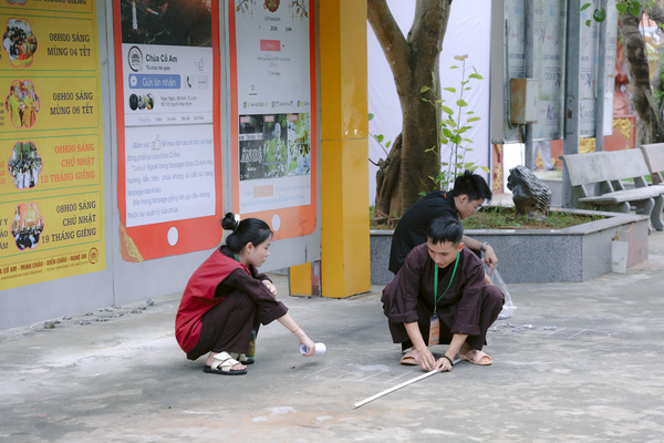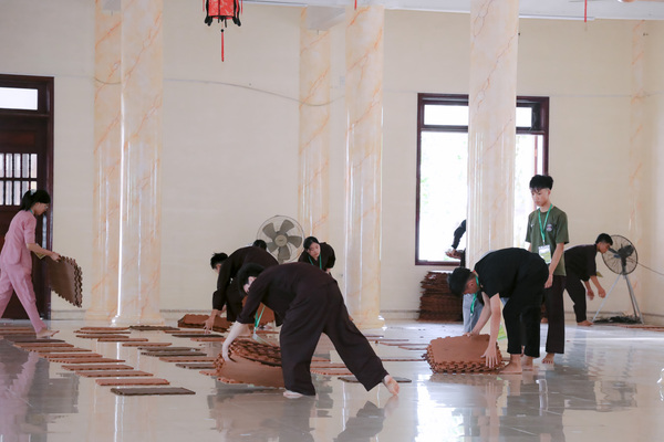 Đến sự tỉ mỉ sắp xếp từng tấm tọa cụ, gối chân của ban hương đăng. Các anh chị không chỉ cẩn thận đặt từng vật dụng vào đúng vị trí, mà còn chu đáo kiểm tra từng chi tiết nhỏ, đảm bảo mọi thứ thật tươm tất;